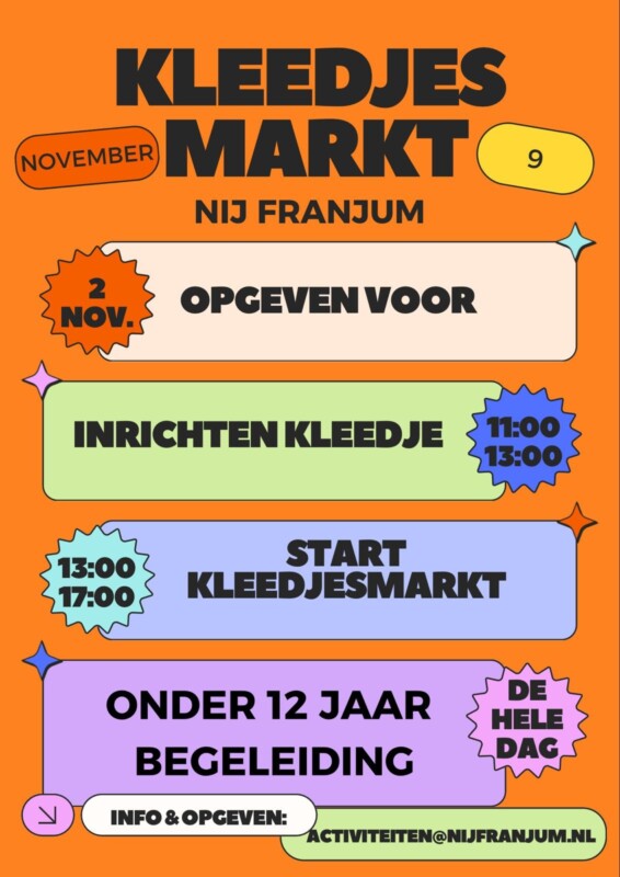 We zijn druk in de weer voor 9 november, wanneer om 13.00 uur voor publiek en kopers de deuren van Nij Franjum opengaan. Het wordt een gezellige boel met van alles en nog wat. Maar… zonder deelnemers en publiek wordt het natuurlijk niks. Er kan nog meer bij !!!!!